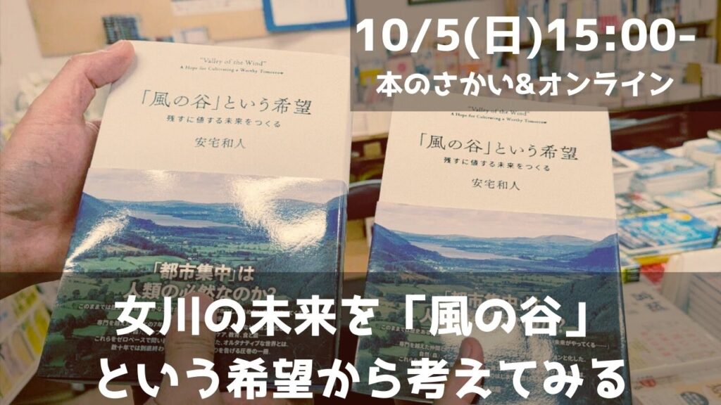 10/5(日)15:00-16:30から、書籍「『風の谷』という希望 残すに値する未来をつくる」を参照しながら、女川をこれから魅力的にするための視点とは何か、などについてフランクに話す会を開催します。
