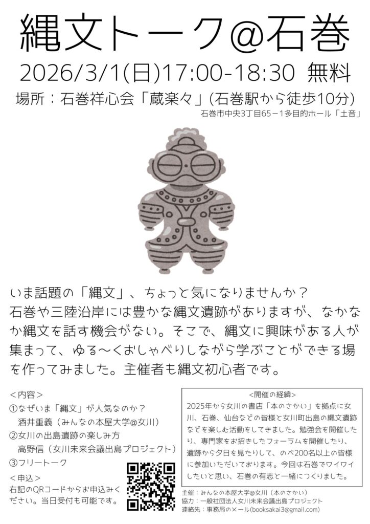 2025年から女川の書店「本のさかい」を拠点に女川、石巻、仙台などの皆様と女川町出島の縄文遺跡などを楽しむ活動をしてきました。勉強会を開催したり、専門家をお招きしたフォーラムを開催したり、遺跡から夕日を見たりして、のべ200名以上の皆様に参加いただいております。今回は石巻でワイワイしたいと思い、石巻の有志と一緒につくりました。